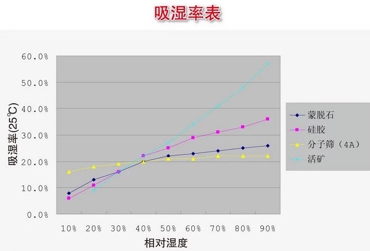 3、與硅膠干燥劑相比,相同的吸濕率產(chǎn)品,價(jià)格要低得多。